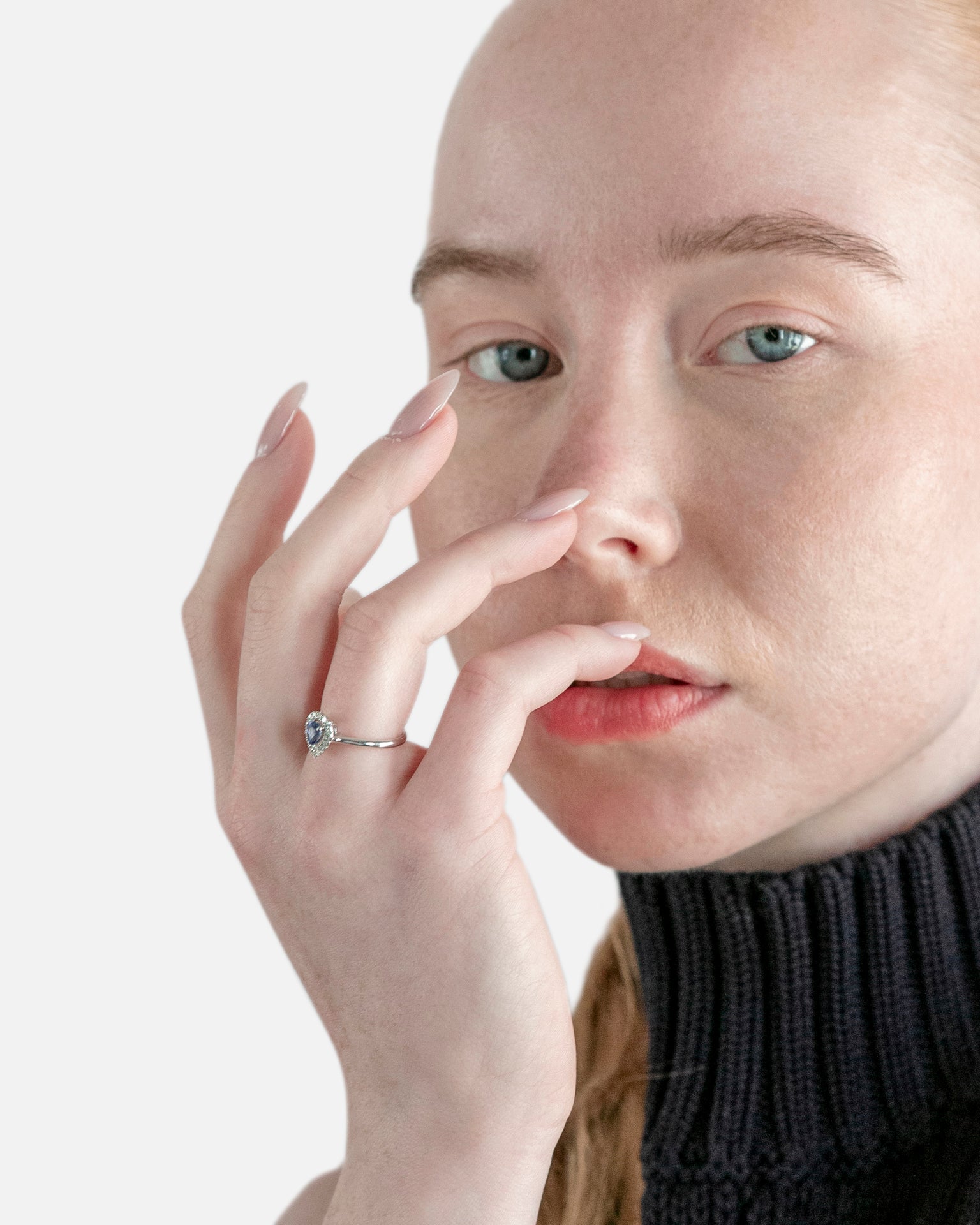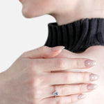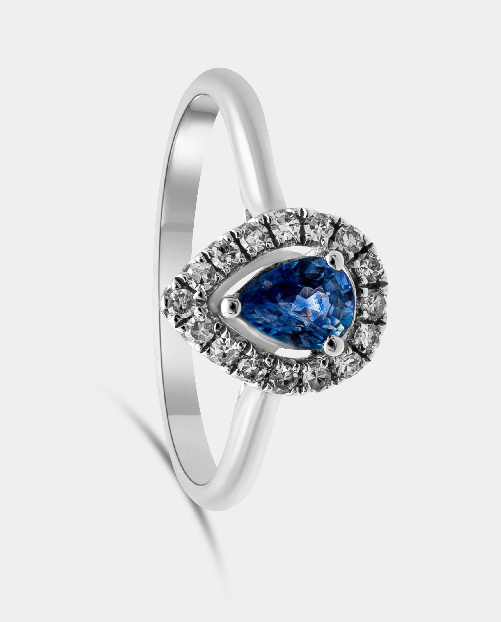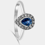 Sortija de oro blanco 18K con un zafiro central talla pera de 0.39ct y orla de dieciséis brillantes de un peso total de 0.12ct.