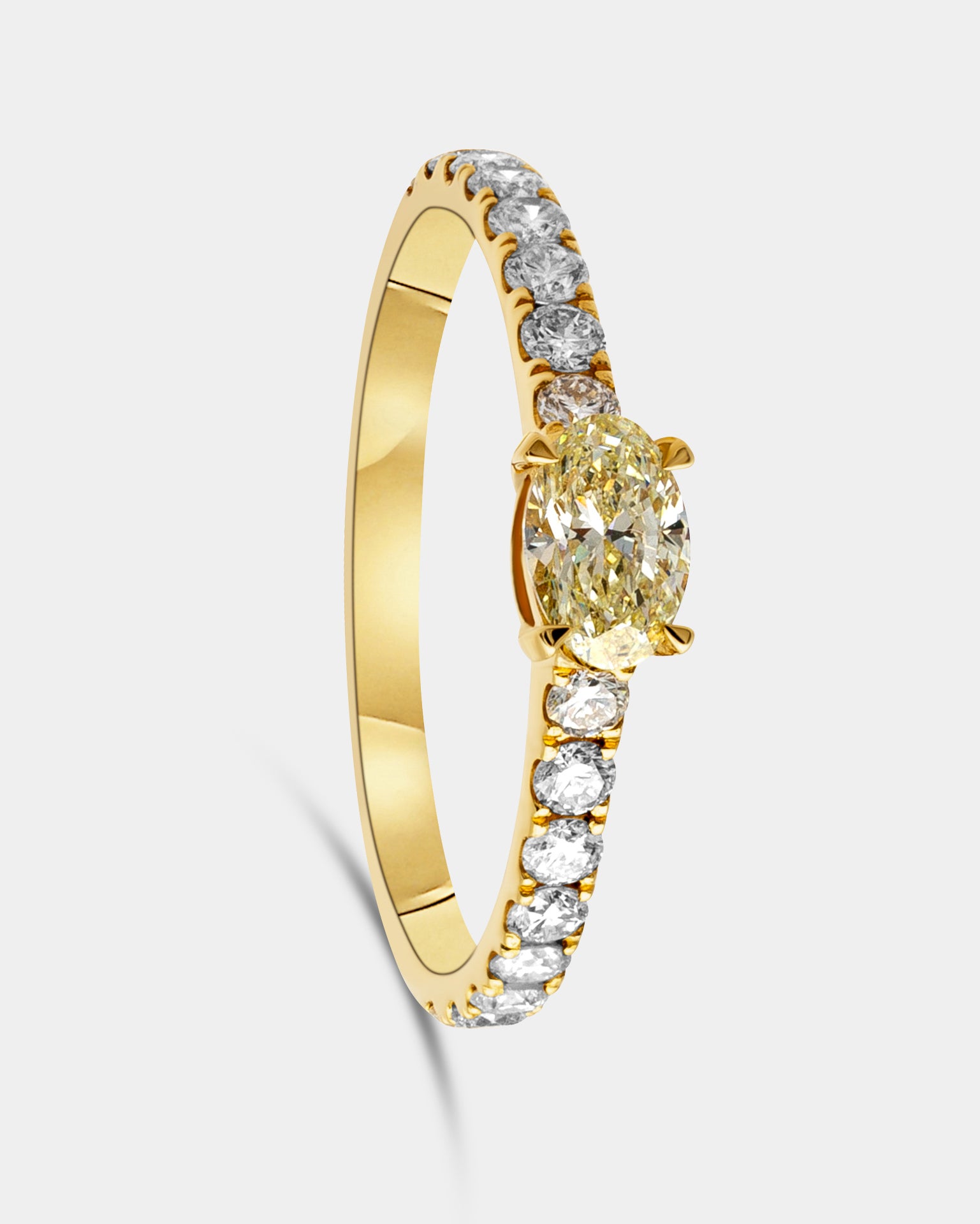 Sortija de oro amarillo 18K con un diamante Fancy Yellow talla oval de 0.31ct y dieciséis brillantes en el brazo de un peso total de 0.40ct.