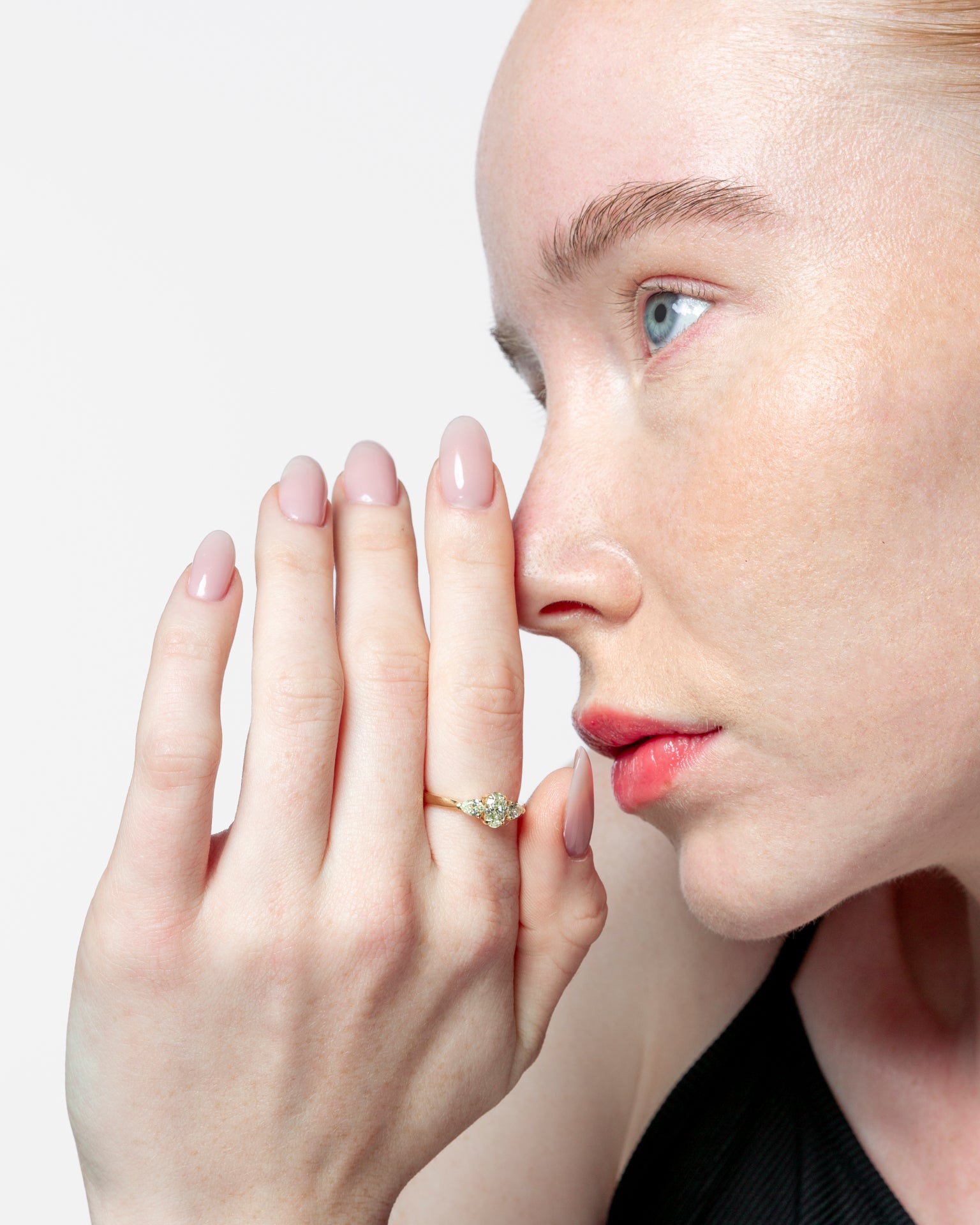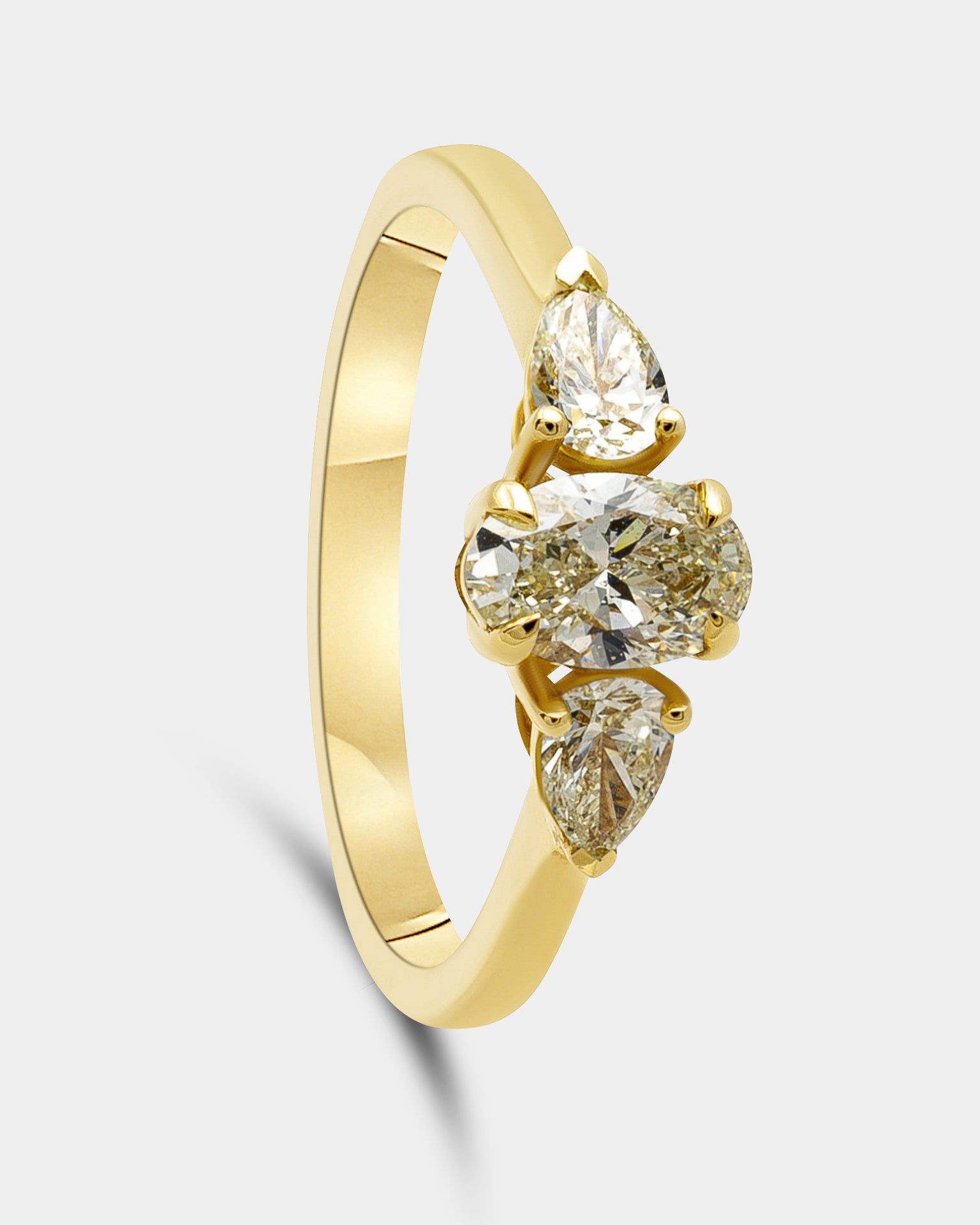 Sortija de oro amarillo 18K con un diamante Fancy Yellow talla oval con un peso de 0.38ct y dos diamantes Fancy Yellow talla pera con un peso total de 0.39ct.