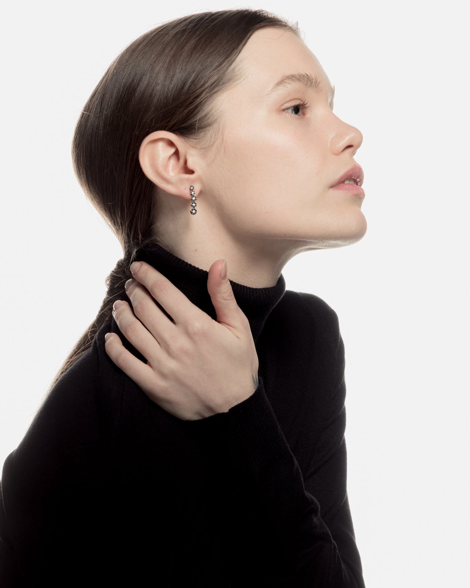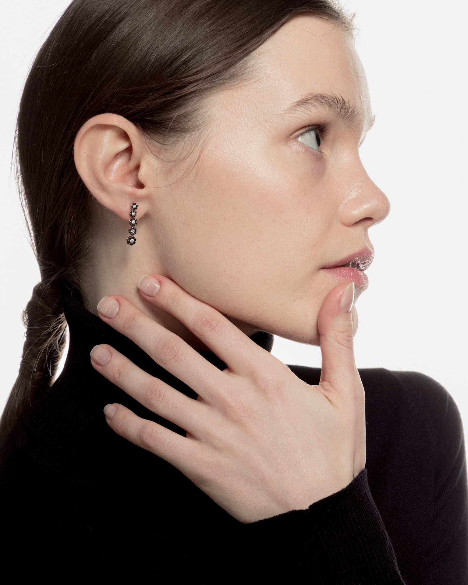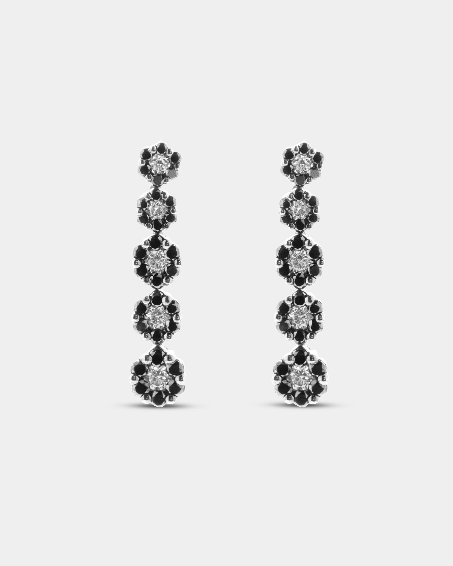 Pendientes en oro blanco de 18K y sesenta diamantes negros con peso de 0.71ct y diez diamantes con un peso total 0.40 ct