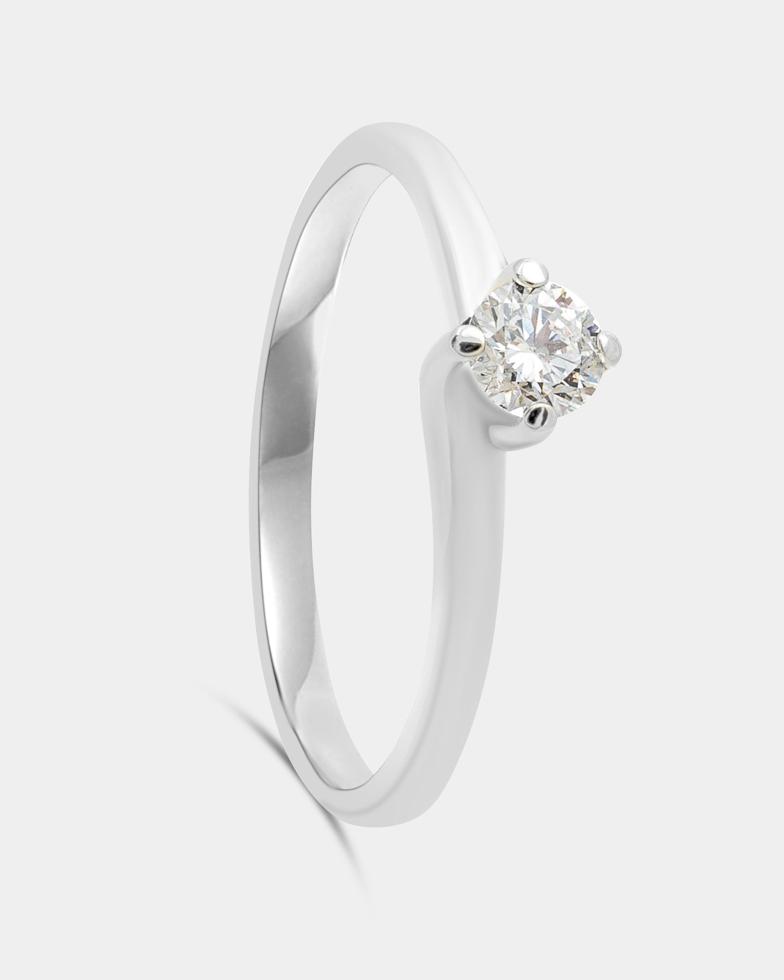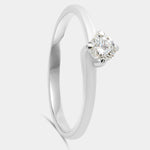 Solitario de oro blanco 18K con cuatro garras giradas y diamante central talla brillante.